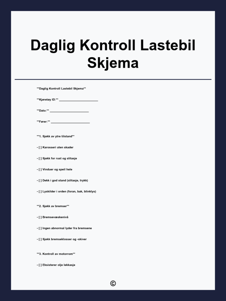 Last ned gratis daglig kontrollskjema for motor og chassis. Sjekk diesel, kjølevæske, motorolje, girkasseolje og hydraulikkolje enkelt og effektivt hver dag.