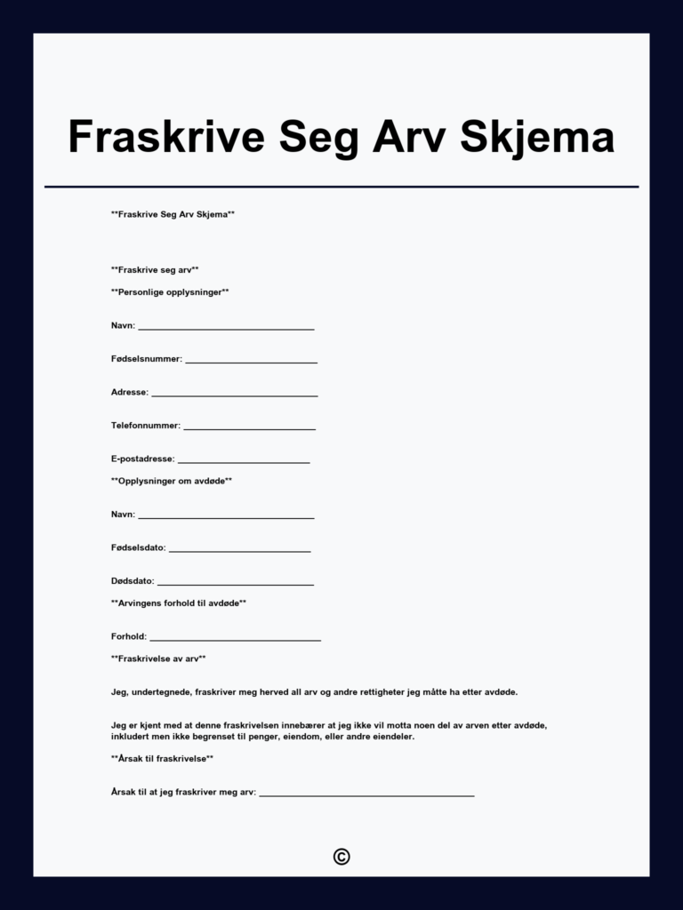 Last ned gratis fraskrive seg arv skjema for privat skifte av dødsbo. Enkel utfylling og veiledning fra Tingretten for arvinger som skal representere boet.