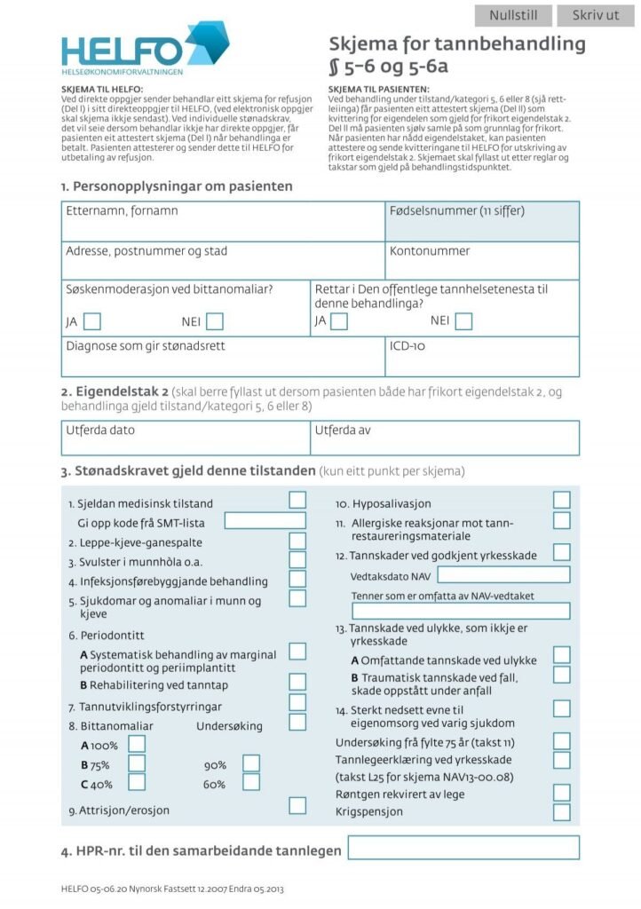 Last ned gratis NAV tannlege skjema 13-00.08 for yrkesskade. Utfylt av kjeveortoped før behandling, klart til bruk ved søknad om yrkesskadehonorar.