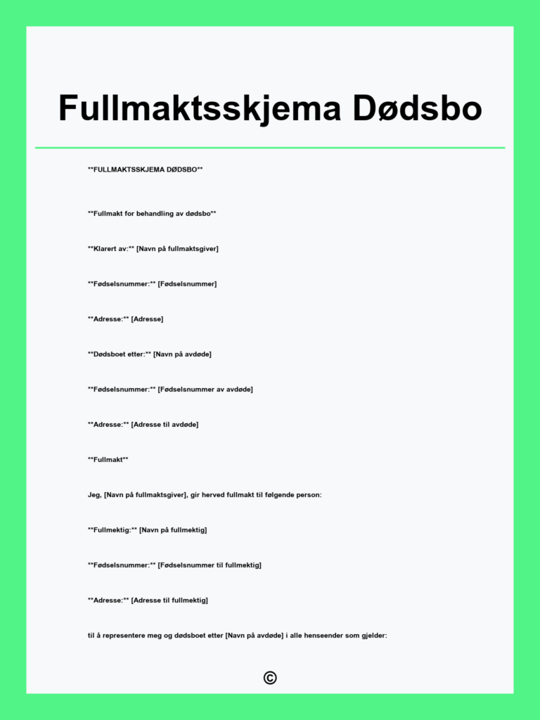 Last ned gratis fullmakt skjema for dødsbo enkelt og raskt. Få full kontroll over behandling av dødsbo med vårt brukervennlige dokument. Gratis og klart til bruk.