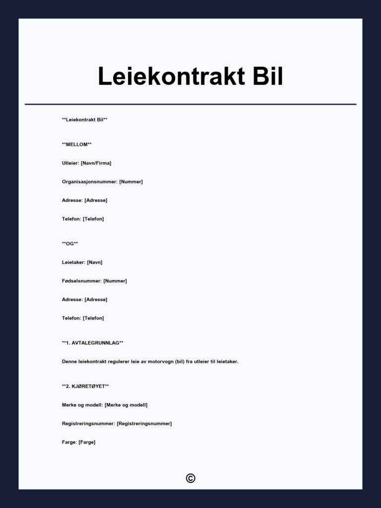 Last ned gratis leiekontrakt bil skjema. Minimumsalder 23 år og 2 års gyldig førerkort kreves. Enkel og trygg leieavtale for både leietaker og utleier.