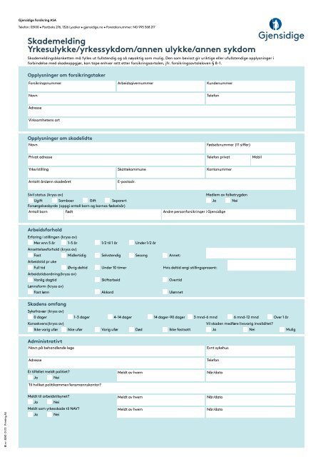 Last ned gratis Gjensidige skademelding skjema for yrkesulykker, yrkessykdommer og andre skader. Enkel utfylling for rask behandling og rehabilitering.