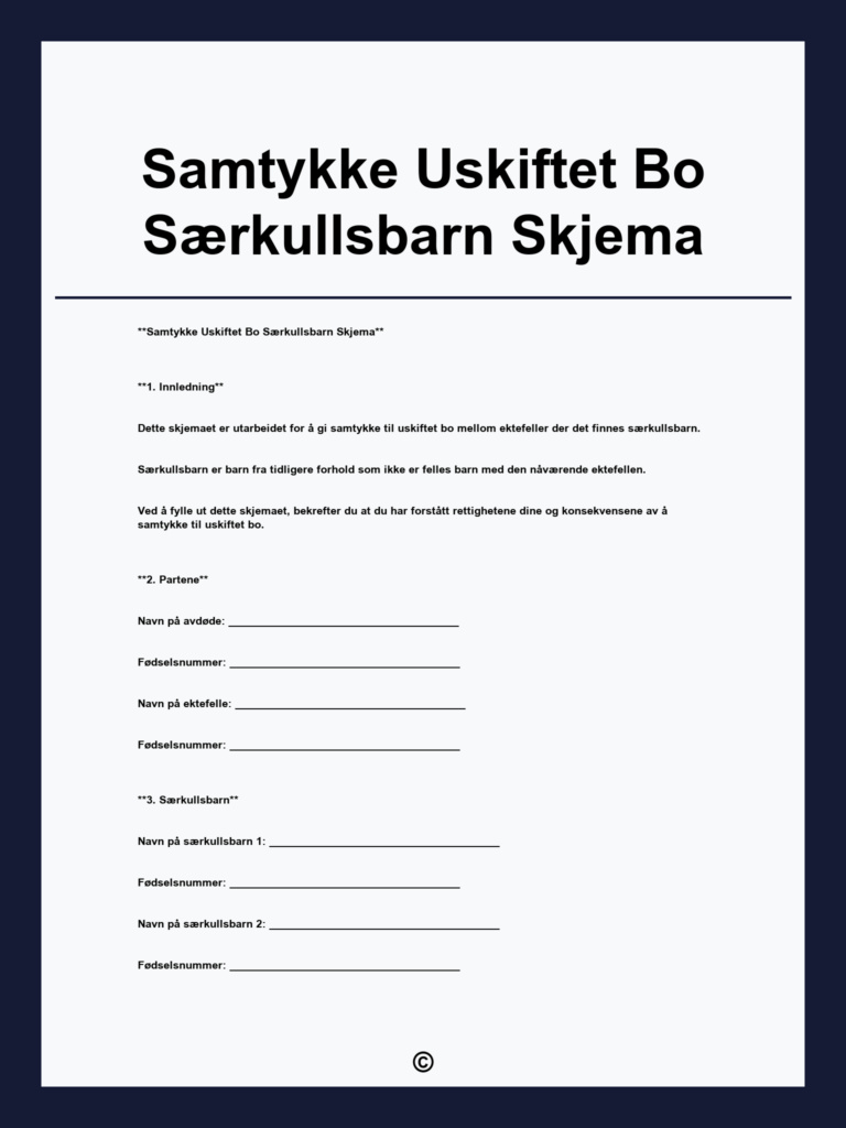 Last ned gratis samtykke til uskiftet bo med særkullsbarn skjema. Enkel og tydelig veiledning for gjenlevende ektefelle og særkullsbarn ved arv og uskifte.