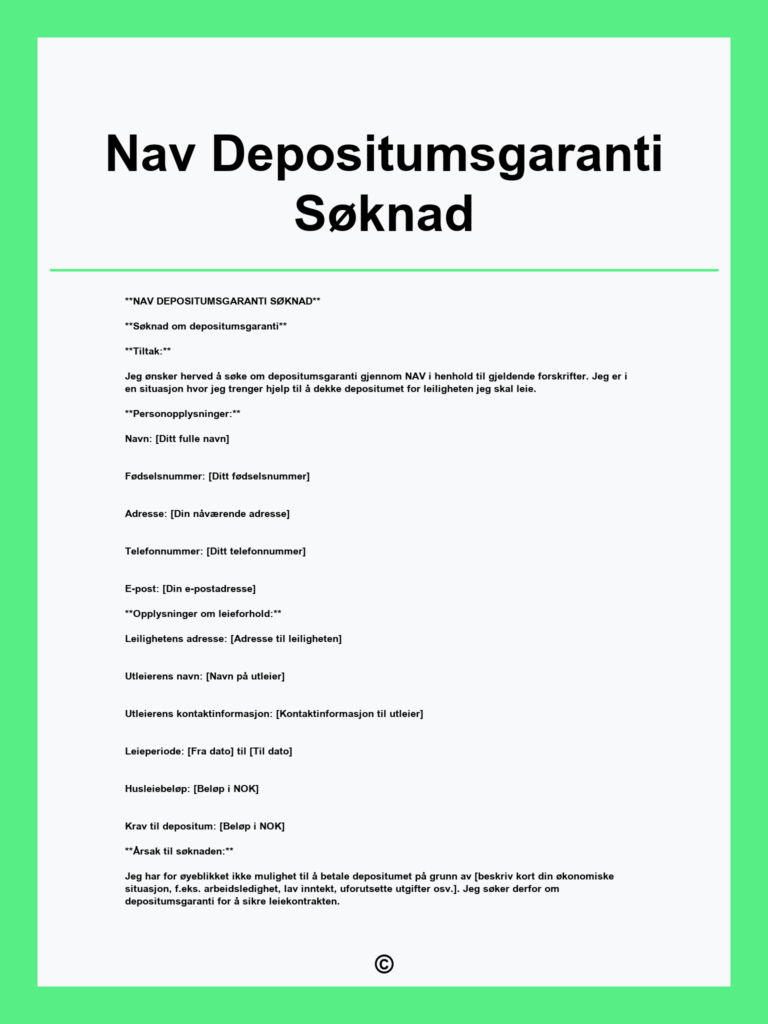 Last ned gratis Depositumsgaranti NAV skjema for søknad om stønad, enkelt og raskt, uten utgifter til depositum ved innvilget garanti fra NAV-kontoret.