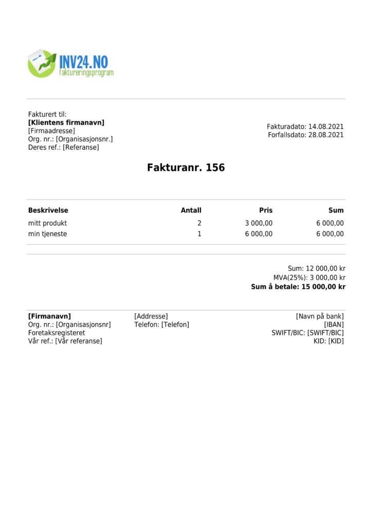 Last ned gratis fakturaskjema med felt for postnummer, sted, land, telefonnummer og organisasjonsnummer/VAT for enkel og korrekt fakturering i din bedrift.