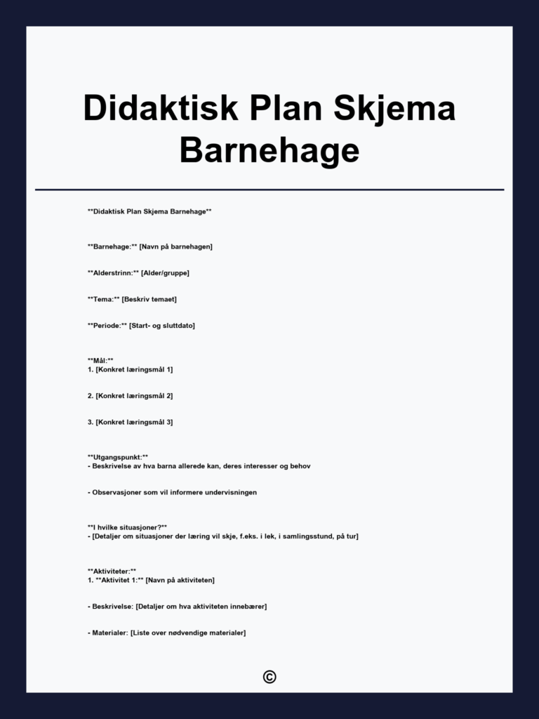 Last ned gratis didaktisk planskjema for barnehage med fokus på vennskap og samhandling. Enkel å bruke for planlegging og gjennomføring av lekbaserte aktiviteter.
