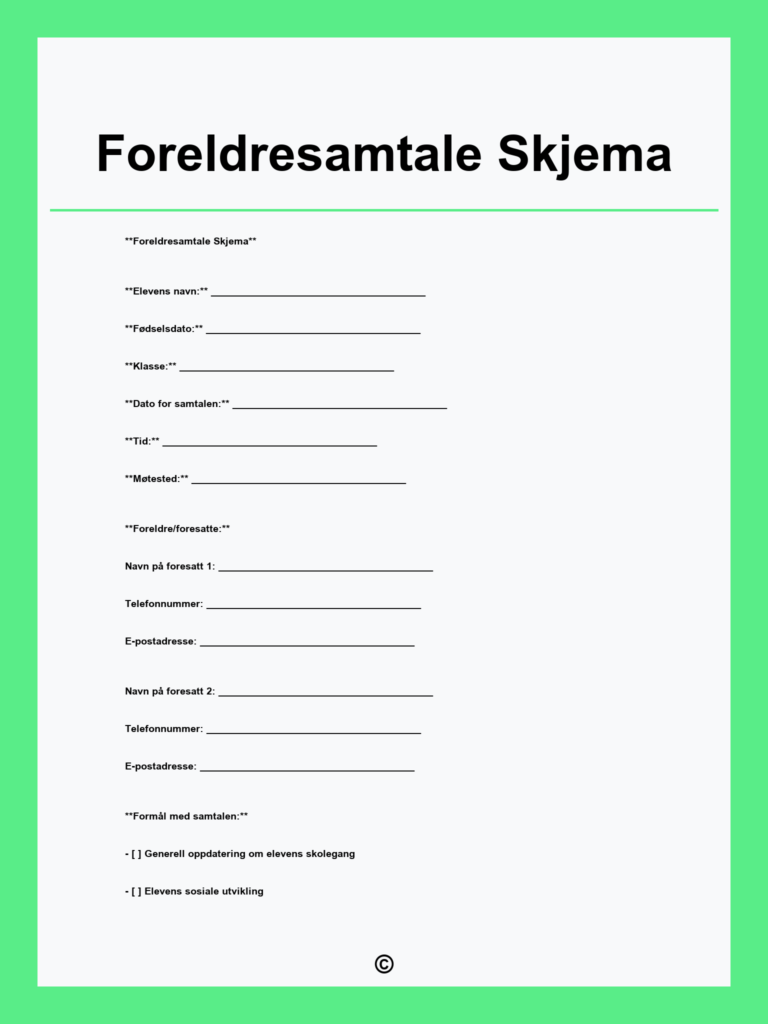 Last ned vårt gratis foreldresamtale skjema som hjelper deg med å forberede og strukturere samtalen med foreldrene på en enkel og effektiv måte.