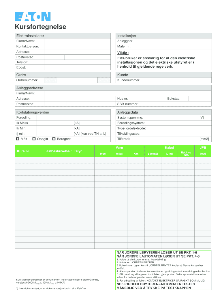 Last ned gratis kursfortegnelse skjema fra NHO Elektrodokumentasjon med komplett oversikt over kursnummer, kursbeskrivelse, vern og kabelspesifikasjoner for enkel planlegging og dokumentasjon.